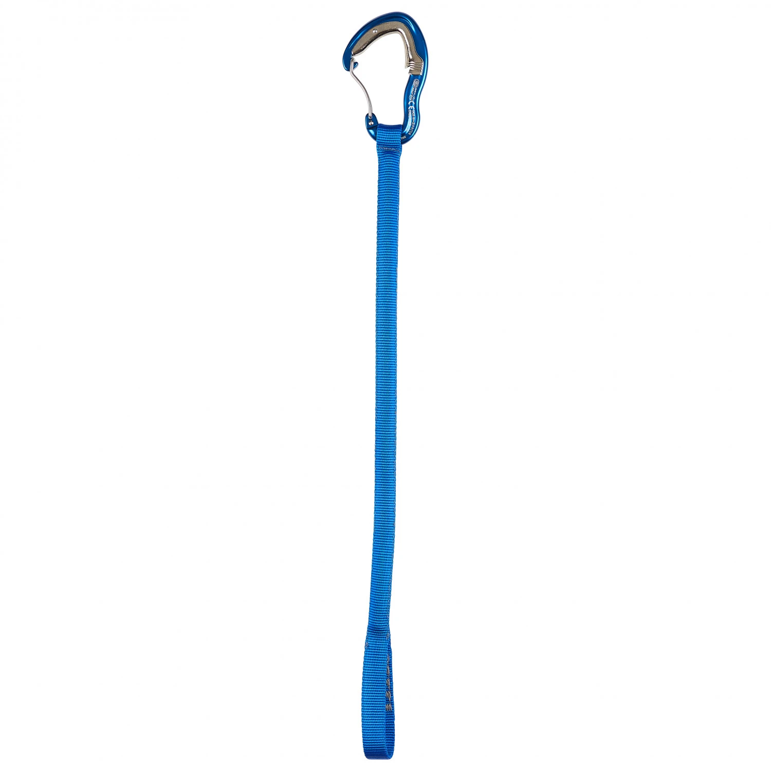 Super pour maîtriser les passages difficiles ! Grâce à la dégaine pratique Panic de The Blue Light, on peut atteindre les pitons mal placés qui sont trop éloignés, car elle possède une longue sangle de 30 ou 50 cm de long (signée Beal) qui possède une certaine rigidité permettant de l’utiliser comme une perche de mousquetonnage. La Panic est équipée d’un mousqueton Kong, qui reste ouvert grâce à un système astucieux avec un mécanisme qui le garde en position ouverte pour pouvoir l’accrocher. Quand on tire ensuite sur le mousqueton, le mécanisme se libère et le doigt se ferme. Pour les personnes de petite taille qui veulent atteindre des pitons éloignés ou tout simplement pour un plus de sécurité : avec la Panic, le haut de la falaise n’est plus très loin !